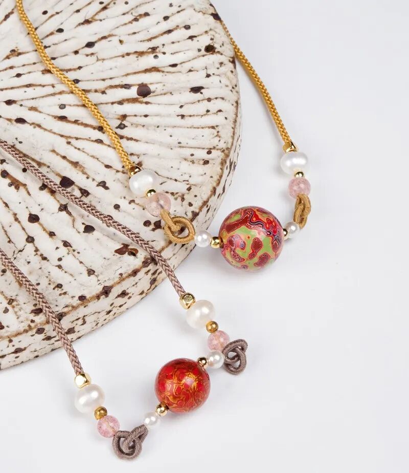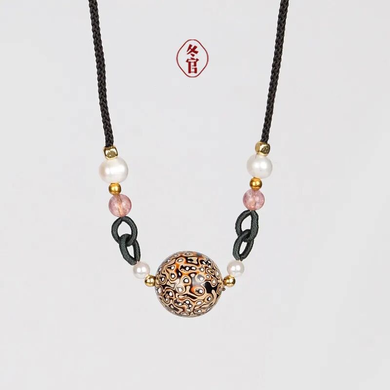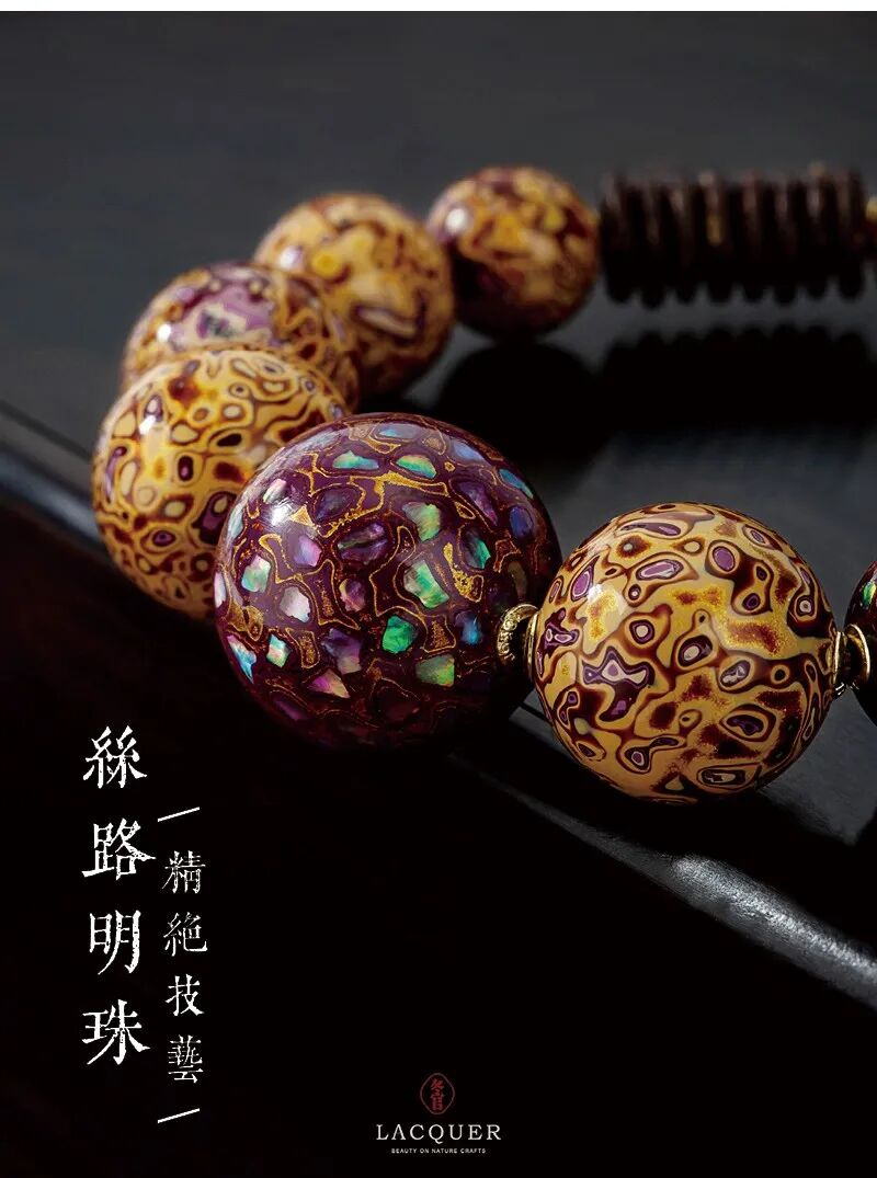 顶珠精选复古大漆珠,大漆作底,加以色矿、银箔、细螺钿、中目欧珀,在室光下就璀璨夺目,近看更是如梦似幻。