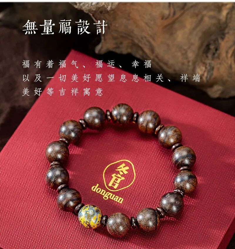 素雅沉静的沉香木珠,别具古韵,腕间生香,再点缀古老手工艺做成的大漆珠,虎皮斑斓,流光不朽。