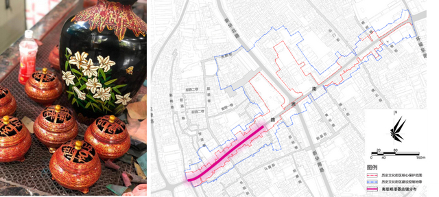 阳江漆器髹饰技艺(左)和20世纪三四十年代南恩路漆器店铺分布示意图(右)