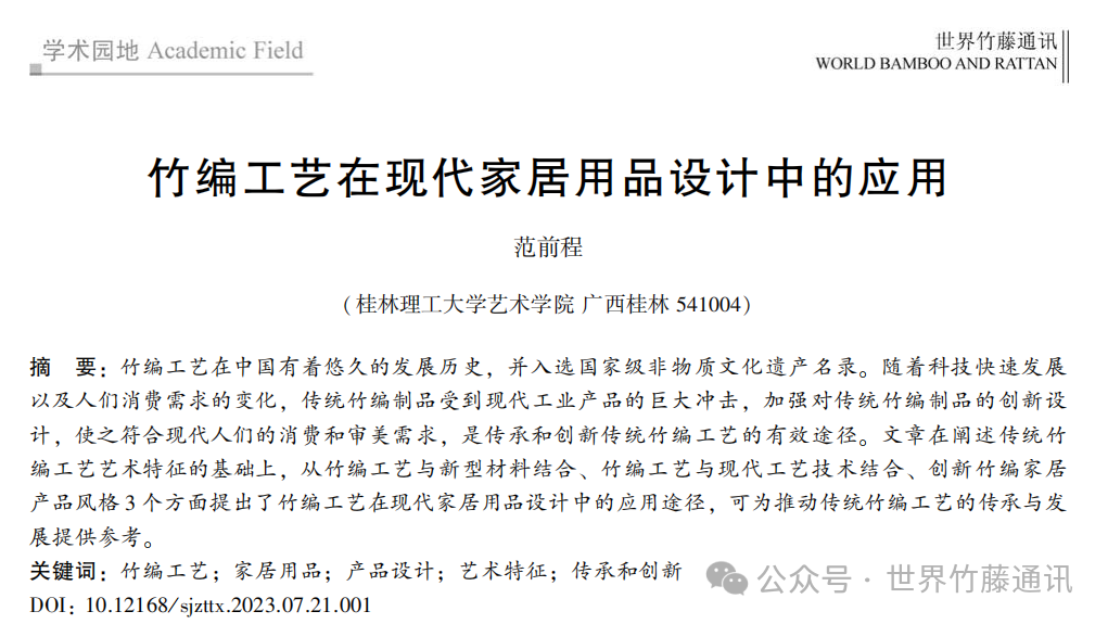 【引用格式】:范前程. 竹编工艺在现代家居用品设计中的应用[J]. 世界竹藤通讯, 2024, 22(1): 77-81.(点击阅读/下载全文)