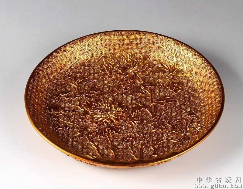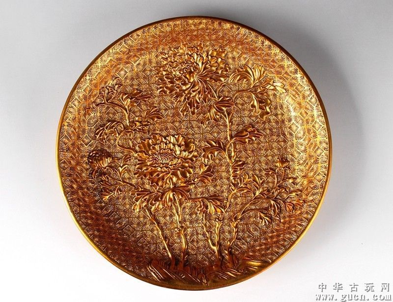 清末民国牡丹纹脱胎印锦漆盘 直径23.2厘米,高3.5厘米