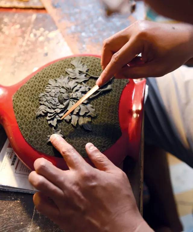 雕漆在福建省以前很出名,沈绍安创造脱胎漆器的时候,这种技法已经失传了,失传以后就是陈氏上两代陈枝枝,他看到雕漆那么好,就想到应用到脱胎漆器上,以前民间菩萨等东西,它的衣服、盔甲都是漆雕的,他自己想,想完以后利用香灰沫加油调制,调完以后变成糊,比较硬一点,倒在事先雕好的花纹模具上,然后利用香灰沫压在模子上面,贴在漆器上。