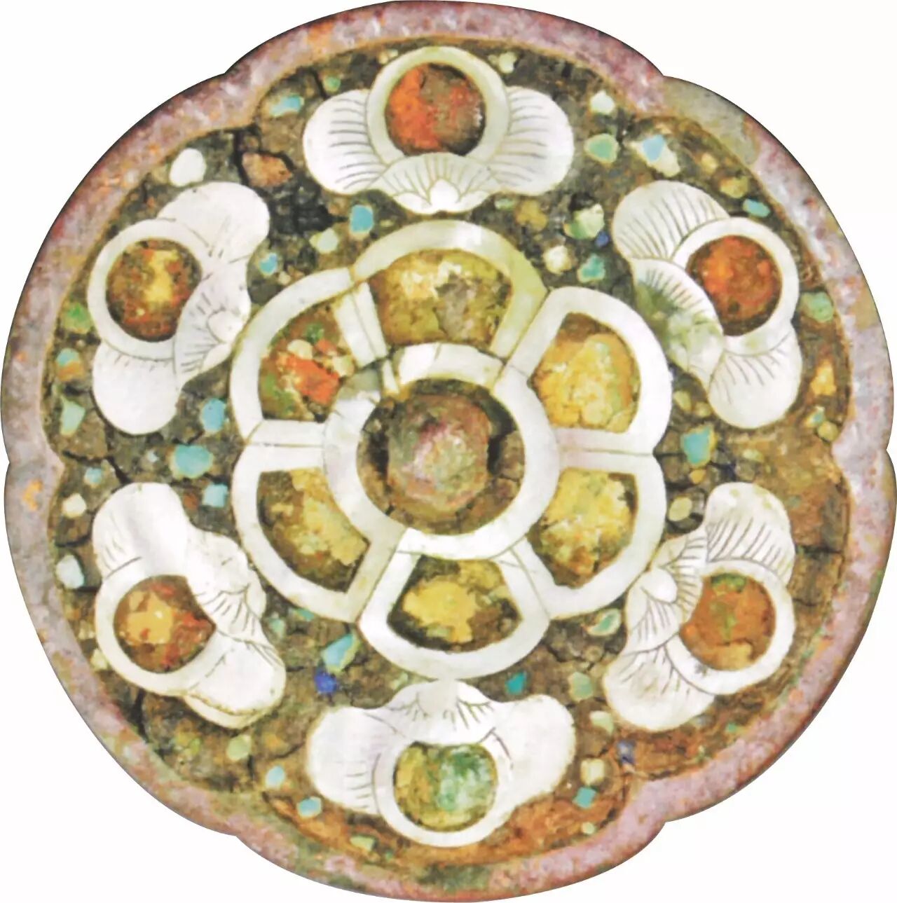 日本奈良东大寺正仓院藏。直径27.4厘米,圆钮,莲珠纹钮座。内区饰花蕾、莲叶纹,外区为四朵大莲枝,中间为盛开的花瓣以及繁茂的枝叶、蔓生的花蕾。整个纹饰由玉石、青金石、贝壳、琥珀组成,色彩艳丽,具有极强的装饰性。