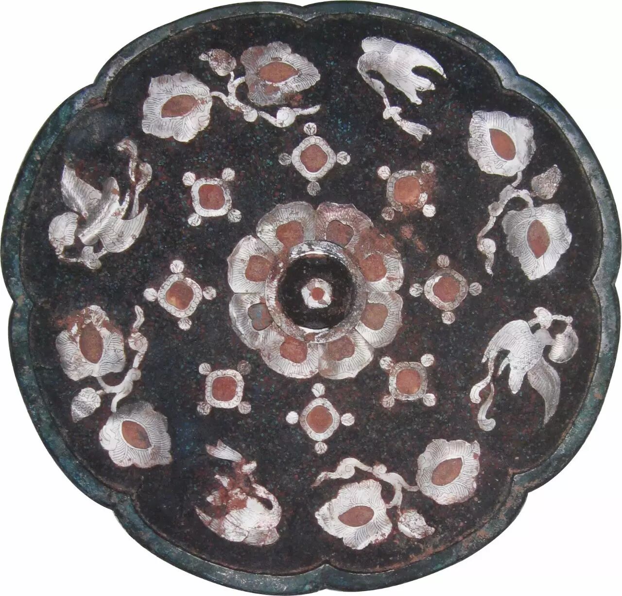 直径7.1厘米,现藏陕西省考古研究院。六出葵花形,半球形钮,亦作镜背髹漆并嵌以蚌片磨制的图案。内区为六瓣花形,外区为6组宝相花图案,周围嵌以细小的绿松石片。宝相花是一种传统的装饰纹样,唐代尤为盛行。它是将莲花进行艺术处理,变成一种具有象征吉祥意义的装饰图案。莲花乃佛教圣门之花,佛像多盘坐于莲花之上。唐代佛教盛行,作为代表佛教净土的莲花被用于各种器物的装饰图案中,铜镜也不例外。