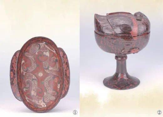 图①:战国彩绘对凤纹圆耳杯。图②:战国雕刻彩绘鸳鸯漆豆。 荆州博物馆供图