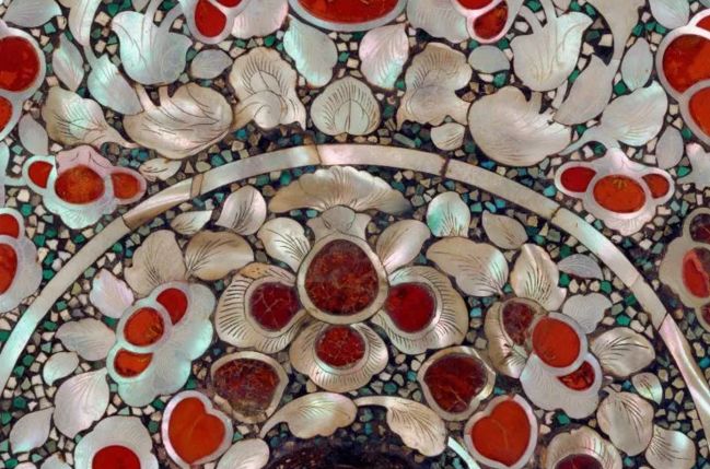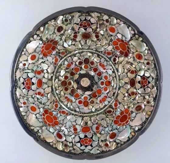 不同造型的螺蚌壳粘到素铜镜背面后,接下来要髹(xiū,用漆涂在器物上)漆、研磨、抛光,最后还要在上面用阴线刻出花纹。经过这一系列处理的螺钿镜,自带七彩宝光的白色螺钿在黑色漆地的衬托下,显得光彩照人,熠熠生辉。有时,为了使螺钿镜更加美观,在螺钿之间的漆地上还会填入绿松石、青金石、琥珀、玛瑙等宝石,这样就更加五彩斑斓、如霞似锦了。