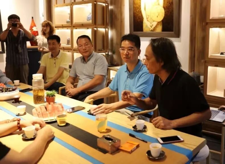 ▲福州市脱胎漆器行业协会会长陈天灨主持座谈会