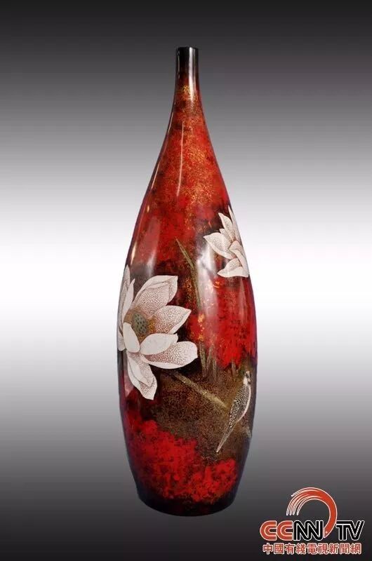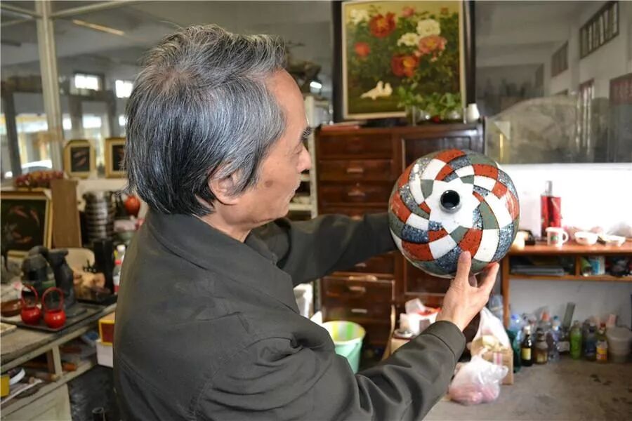 但是不管是漆器还是漆画,只要是漆艺作品设计,就永远追求完美。特别是在脱胎漆器上的设计能根据器型进行装饰设计,因此完成后的作品呈现出来的是型与装饰的完美结合。并且在这几十年,自己的设计能影响着整个行业从传统一步步往现代走,所以个人作品的表现是既传统又现代。在漆技艺的制作上,力求做到精益求精、毫无瑕疵;在材料上也是使用天然大漆等环保材料。在制作过程中能选用最合适的材料来表现,蛋壳螺钿的镶嵌在制作过程中能够表现出画意或能够表现出精致。因多年对漆艺制作得心应手,所以在近几年对市场需求的传统漆器的修复也达到了很高的境界,修复的多件传统漆器能达到修旧如旧,甚至看不到修复的痕迹。