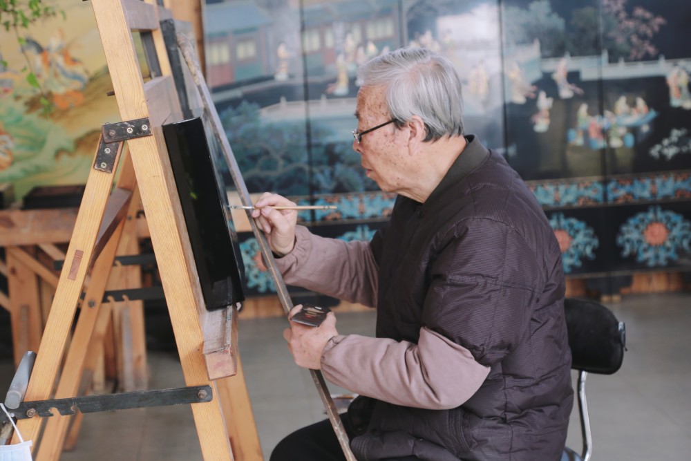 迎着朝阳,85岁的薛生金走进工作室,在宁静的艺术时光里沉浸五六个小时。耄耋之年的他不仅坚持创作,还带徒授艺。在一次次掌间推磨、一笔笔纹样勾勒中,古朴的小院被明亮的漆器装点。