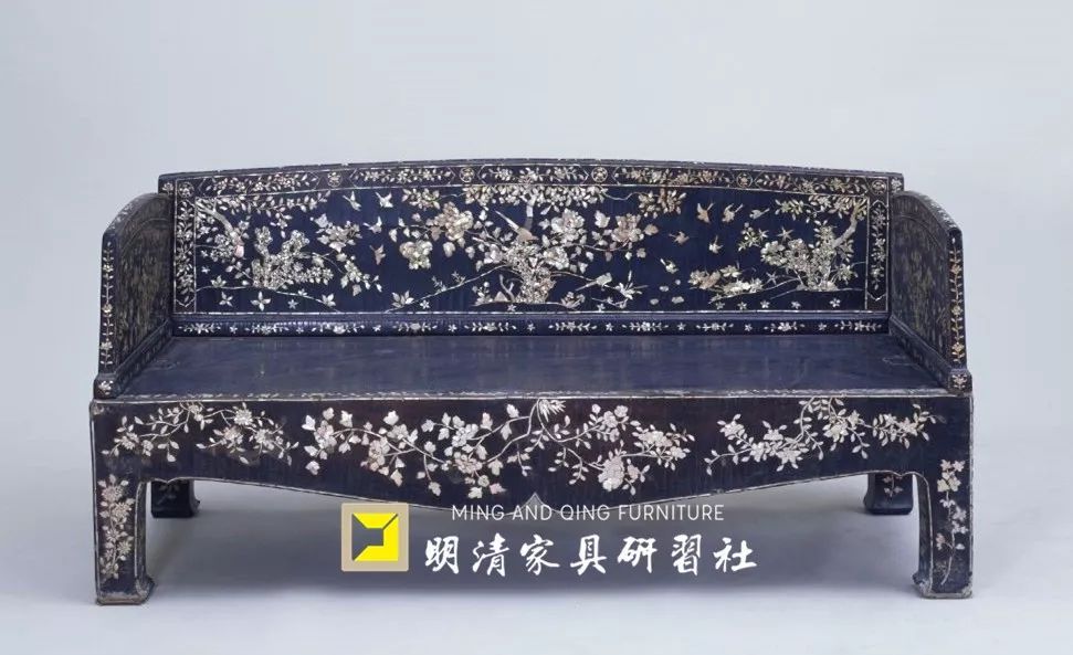 ▲明 黑漆嵌螺钿花鸟罗汉床,高86cm,长182.5cm,宽78cm