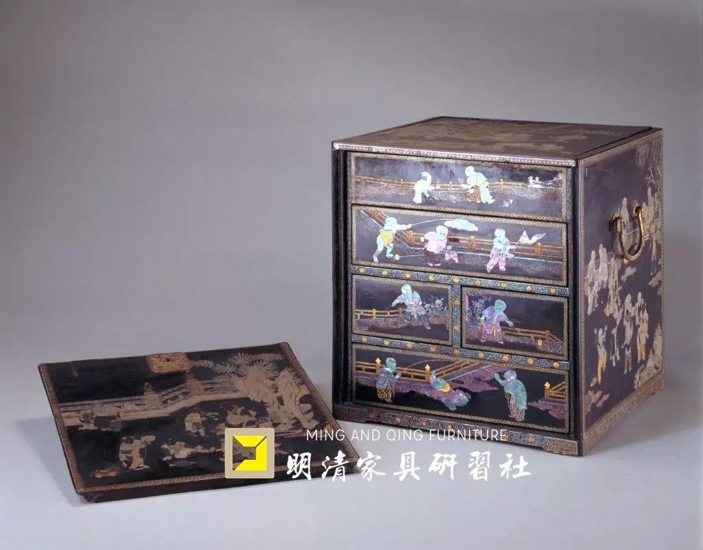 除箱底外,其余各面及抽屉的外立墙均为黑漆地,上用薄螺钿及金、银片嵌成庭院婴戏图,共有幼童100名,组成“百子图”。