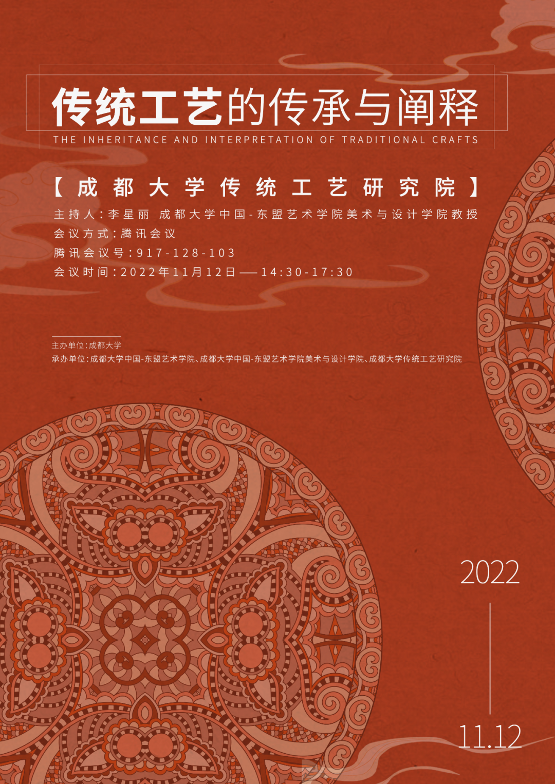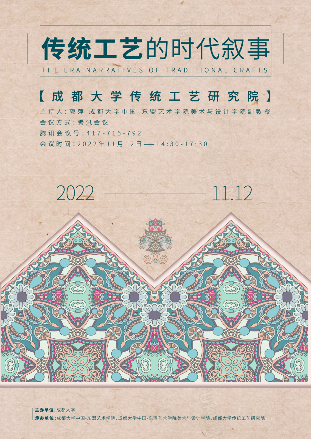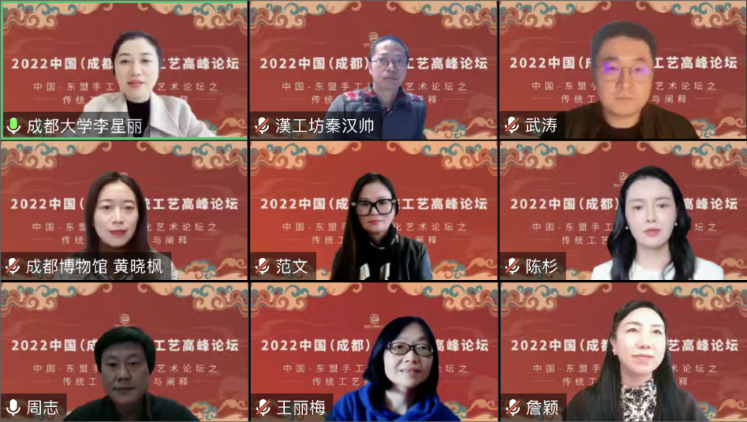 2022年11月12日,成都大学主办的2022中国(成都)传统工艺高峰论坛--中国-东盟手工艺文化艺术论坛在线上如期举行。论坛分设“传统工艺的时代叙事”、“传统工艺的传承与阐释”两大主题分论坛,来自清华大学、上海大学、天津美术学院、广州大学、重庆大学等国内知名高等院校,四川大学、四川师范大学、西华大学等省内兄弟院校,中国丝绸协会、四川博物院、成都博物馆等文化事业机构,以及成都漆器工艺厂、“成都手作”、“CraftPlus项目”等传统工艺品牌的共21名专家学者和相关负责人参加了论坛。论坛分别由成都大学中国-东盟艺术学院美术与设计学院郭萍副教授、李星丽教授主持。