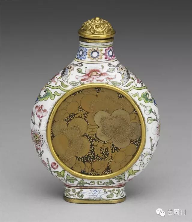 即使小巧如鼻烟壶,亦出现同时揉合亚洲和西方的装饰风格。如中心开光的金漆梅花纹片,表现出流行于欧洲市场的日本莳绘图样,而开光外的白地梅花和蝴蝶,则为中国传统纹饰,象征文人的气节和长寿。