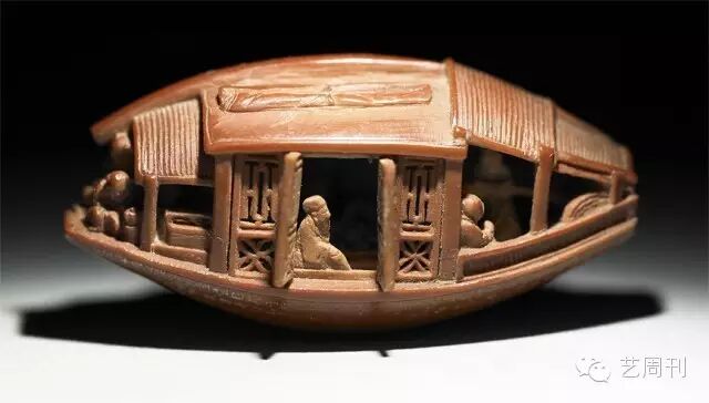 来自广东,于雍正时期已进入造办处的陈祖章,在乾隆二年(1737),依照橄榄核天然的外形,将一个果核雕琢成一艘小船,船上乘载八人,每一位人物的动态、表情各有不同。最特别的是,船底刻苏轼的〈后赤壁赋〉全文,三百余字,细密井然,堪称鬼斧神工。