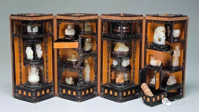 收阖时,这件多宝格是个再规矩不过的方盒形。此种样式的优点是所占体积最小,利于收贮。然而,外形虽简单,看来却不显单调。原因在于工匠运用「开窗」的装饰手法,一方面让人能欣赏到书画;另方面又使人对窗内产生期待的心理。不负众望的,方盒在一一抽去隔板、推出四个扇形后,造型剎时间变得有了流动感,加上中心圆璧回旋的效果,我们几乎以为它会像风车一般开始转动!若你以为,寻宝的乐趣已结束而就此停手,那损失可大了!其实,方盒底部的须弥座也是一个贮藏空间。这种手法和现代室内设计利用地板下储物,概念是一致的!是不是很有创意!?
