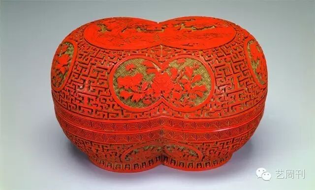 外形作两圆相交,故称双缘(圆)宝盒。全器施涂两种漆色,下层泛黄、上层鲜红,藉由上下漆色呈现纹饰的主体。盒面开光,浮雕职贡图,器内壁髹黑漆,以金彩描绘折枝花卉。圈足内亦髹黑漆,刻款填金,铭文为:「双缘宝盒」及「大清乾隆年制」的款识。
