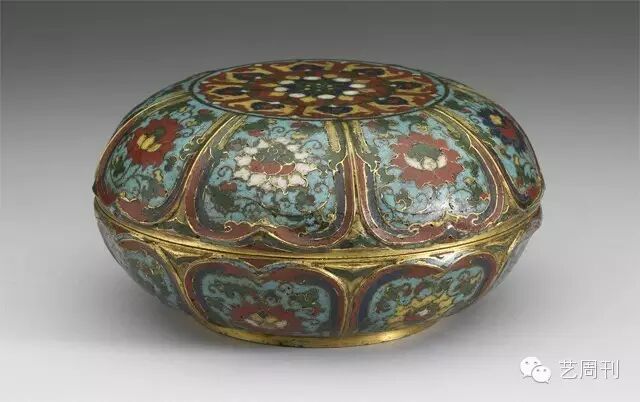 铜胎掐丝珐琅圆盒,造形取材自莲花。平顶,以莲花心含莲蓬图案为装饰。盒身与盒盖之弧形外壁,模铸仰覆莲瓣形,莲瓣周棱突起,瓣尖微卷外扬。各莲瓣框棱内,各饰一朵折枝莲,各莲之花心图案及细部线条不尽相同。全器入手沉重,制作精雅,掐丝线条严整,在线镀金痕犹明晰。所施鹅黄、靛蓝、浅蓝、鲜红、莹白诸珐琅色料均厚实鲜亮。器里及底均镀金,盒内底心中央横刻细字楷款:「大明景泰年制」。掐丝珐琅器在元代称为「大食窑」或「鬼国窑」,制有炉、瓶、盒、杯、盏之类器用,虽然明初洪武间为赏鉴家曹昭讥为「但可妇人闺阁中用,非士夫文房清玩也」。然此种工艺在明代制作极盛,俗称为「景泰蓝」,盖因景泰年间(1450一1456)宫廷作坊所造的珐琅器最富盛名之故。明未尝鉴家以之与成化瓷器、宣德铜器、永乐漆器并举,推崇为明代最重要的工艺成就之一。传世景泰款器真伪杂陈,本件香盒为难得的时代风格相符的有款器。