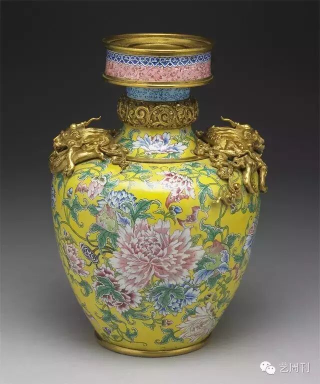 清雍正时期在皇室高度关注下,源自西方的画珐琅进入一个全面发展的阶段。无论瓷胎、铜胎、玻璃胎、画珐琅不仅色彩鲜丽,纹饰亦极其讲究。画珐琅蟠龙瓶器表的牡丹花为传统中国吉祥图案,而器肩两侧镶嵌的夔龙和颈上装置的卷草环,雕工精细,或可看成是吸收西洋技术之后,转而对传统工艺所做的再诠释。