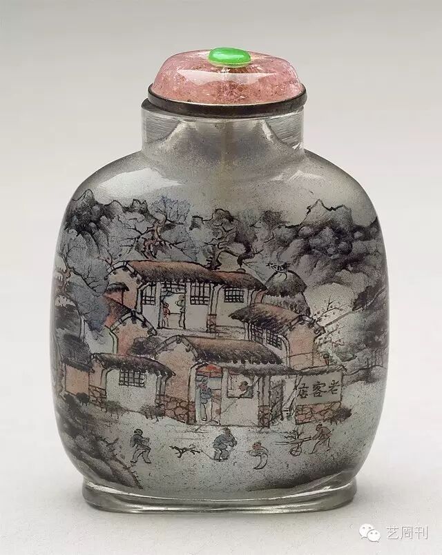 十七世纪末西洋的鼻烟和鼻烟盒进入中国;盛清时期,西洋各国及罗马教廷常以鼻烟和鼻烟盒进献朝廷。鉴于以鼻烟盒盛装鼻烟并不十分理想,于是当时人将明朝人用来装平安散、驱风油一类的敛口小药瓶加以改良,成为我们现在所见的鼻烟壶形式。瓶盖用软木塞塞紧,软木塞中间插上一根小长把细匙,好舀出鼻烟,或盛在小碟上,或盛在手心里,再捻出一些入鼻嗅用,《红楼梦》第二十五回就有一段晴雯生病,头疼、鼻塞的症状,靠贾宝玉的鼻烟,通了鼻塞的描述。有清一代,随着鼻烟的风行普及,鼻烟壶相当流行,盛清时期就有各种材质制成的精采作品,嘉庆时期在鼻烟壶制作上的重大创新,就是内绘技法的使用。在小小的玻璃鼻烟壶内壁作画,想来就是一件极度困难任务,先以金刚砂和小钢珠倒入壶内摇晃,让表面变粗糙,颜料容易附着,再以特制有弧度弯头的细尖竹笔,伸入口径往往不到半公分的壶内描绘。此件作品描绘乡野景致,人物、建筑的精细绘制,山石甚至作出渲染的效果,一面近颈处有工匠署名,「写于冬月,周乐元作」,此壶为清宫旧藏,周乐元活动于十九世纪末,因此此件鼻烟壶应属十九世纪末地方上贡的作品。