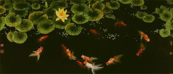 在花鸟虫鱼漆画中,金鱼作品无疑名声最大。熟谙漆性的漆画家,都说金鱼是一个非常适宜用漆表现的“讨好”题材。漆画家面对黑漆板,仿佛国画家面对白宣纸,“只画鱼儿不画水,水中自有波涛”,那洁白的宣纸就是水,那晶莹的黑漆更神似水,这就给观众一个想象的空间,表现了东方人的“意象”审美情趣。