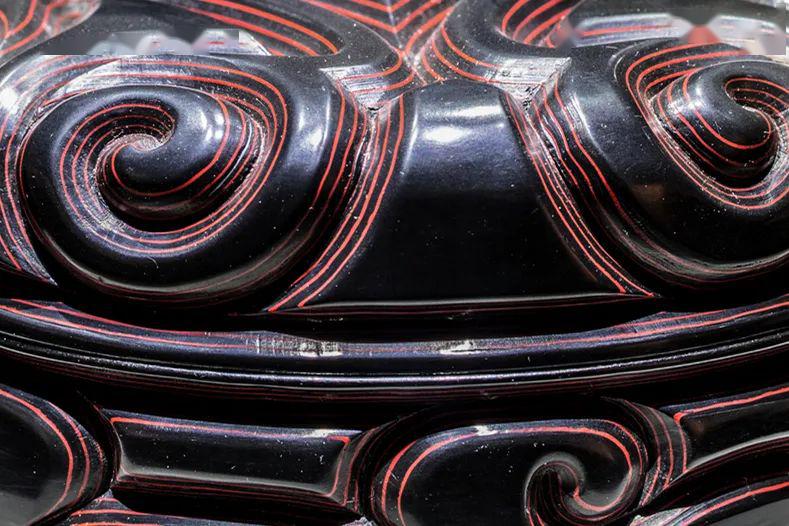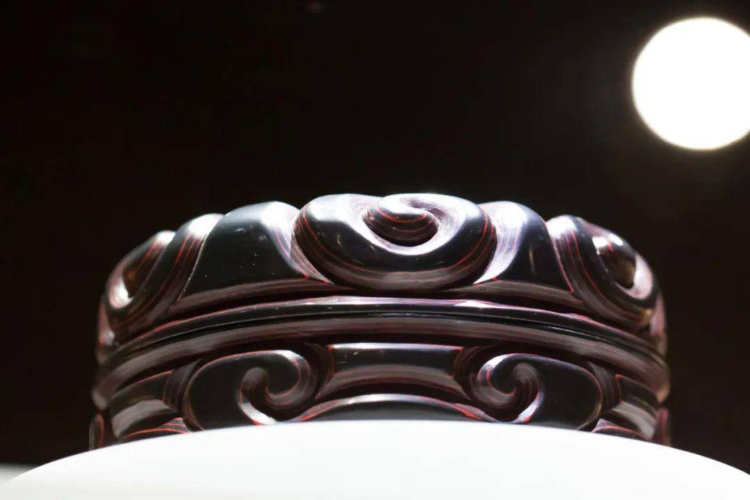 漆盒的盖和底分别饰有三组云纹,底部的云纹有所简化,呈现出双涡卷结构,这种云纹被称为“如意云纹”,曾被广泛应用于服饰、金银器、建筑、家具的装饰上,也是“剔犀”漆器最为常见的纹饰。飘逸流动的线条不仅体现出剔犀的叠层之美,而且表达了人们祈福纳吉的美好愿望。