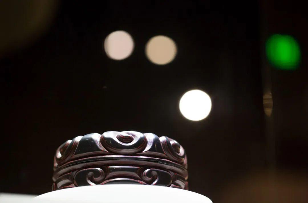 “张成造”剔犀云纹漆盒是安徽博物院的八大国宝之一,通高9.5厘米、直径14.5厘米,通体黝黑发亮,大气华美。盖和底分别雕刻有三组如意云纹,刀口深峻,磨工圆润。刻面上可以清晰地看到三条朱漆带,流动婉转,富有生意。在底部边刻有“张成造”三个字。