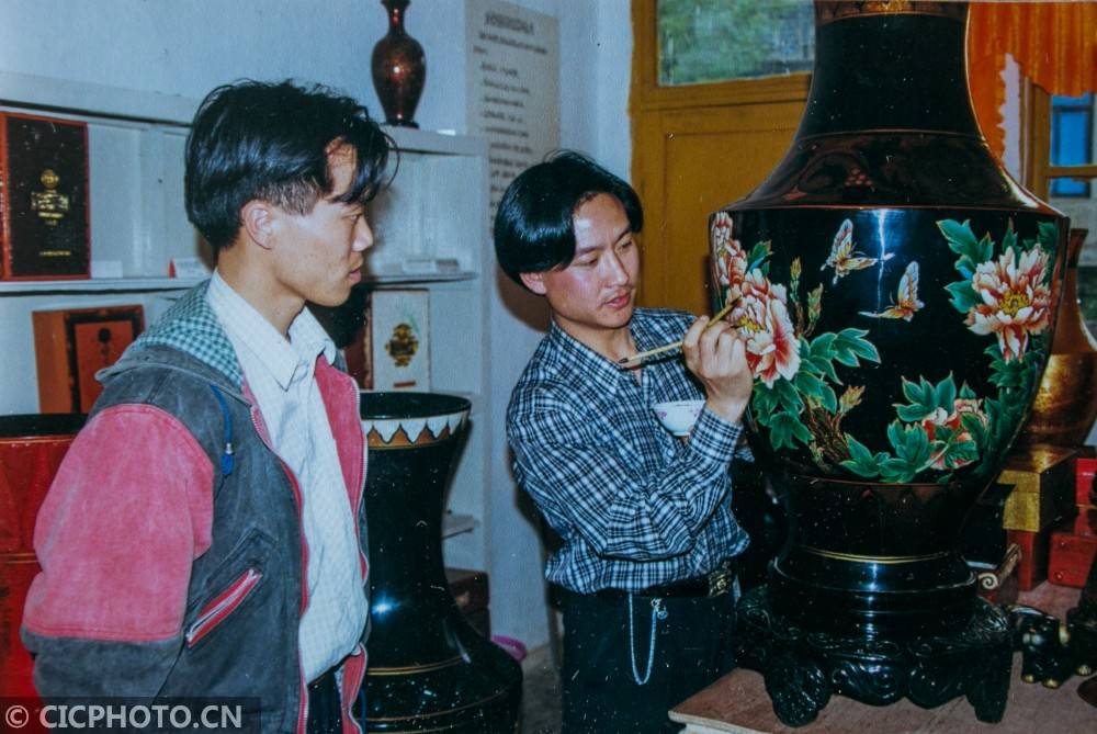 ↑1994年,在贵州省毕节市大方县国营漆器厂,高光友(右)在给同事示范漆器绘画技巧(资料图片)。CICPHOTO/罗大富 摄