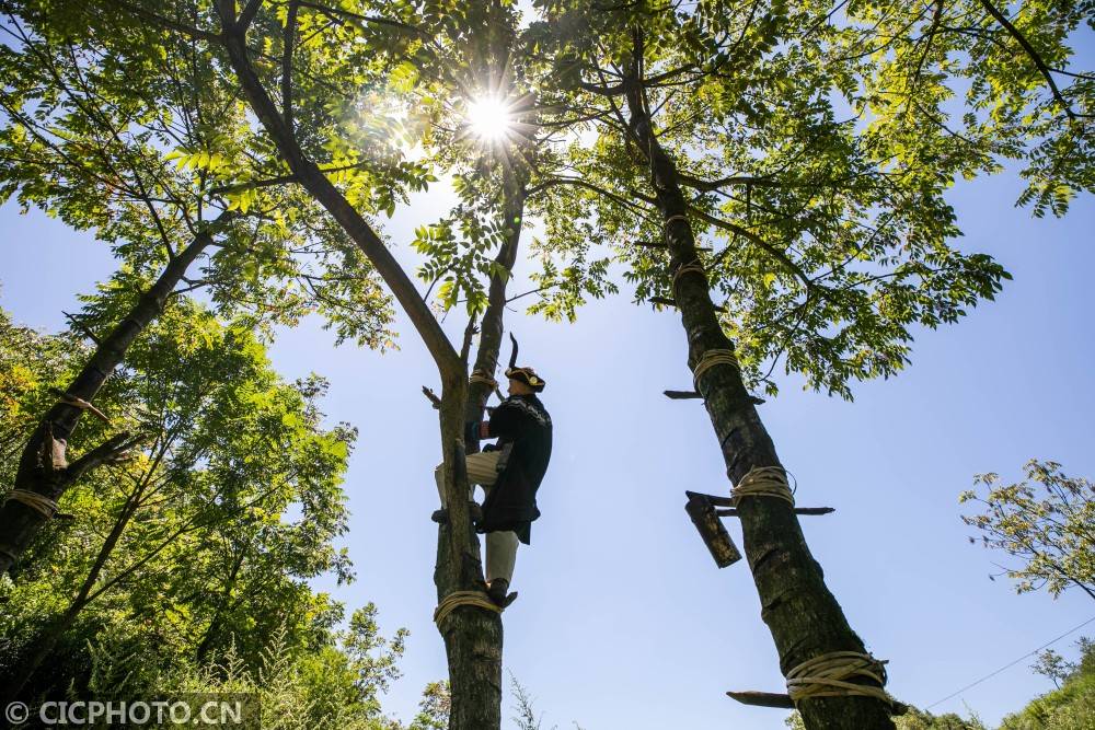 ↑2020年8月26日,在贵州省毕节市大方县星宿乡重山村,高光友在采割生漆。CICPHOTO/罗大富 摄