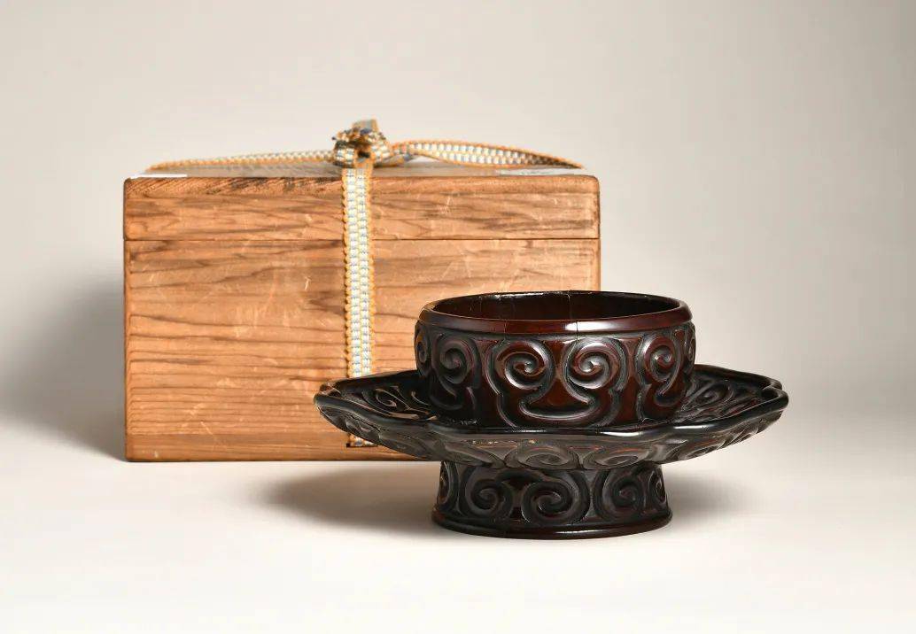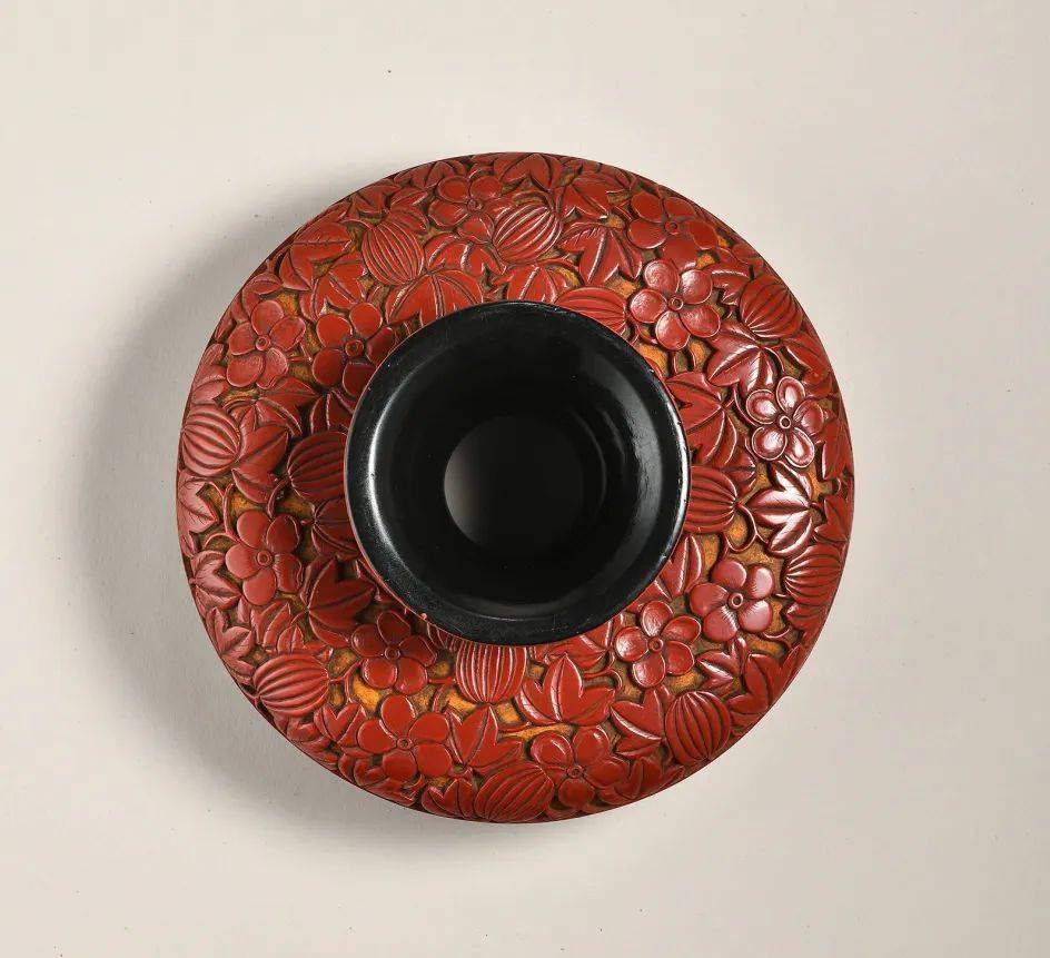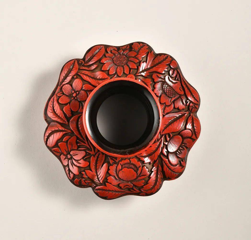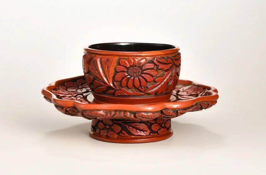 元明之际雕漆工艺盛行,器型以盘、盒最为多见,盏托相对较少,此件复色雕漆盏托元风浓郁,兼工精艺妙,当非寻常人家用器。