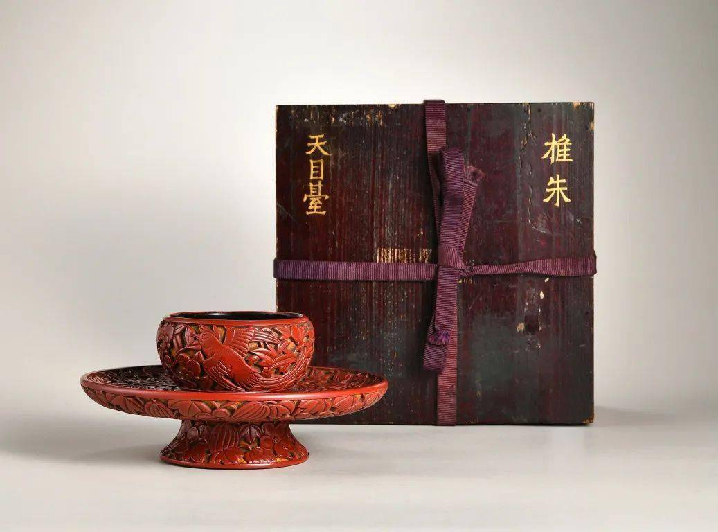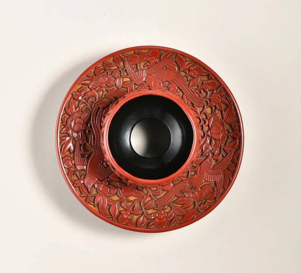 整器造型优雅别致,工艺精湛细腻,漆色纯正细腻、莹亮光润,立意祥瑞高深,可谓上品佳器无疑。其所用绶带鸟穿花纹样,乃元末明初颇为典型的雕漆纹样,于两岸故宫及各大博物馆中皆有所见,典例如美国大都会博物馆藏元代剔红绶带茶花纹圆盘,其绶带鸟之线条气韵与本品相类。此纹样多见于盘、盒器型之上,盏托则颇为稀见。北京故宫存一例明永乐剔红云凤纹盏托,构图与本品相似,亦可资参照。