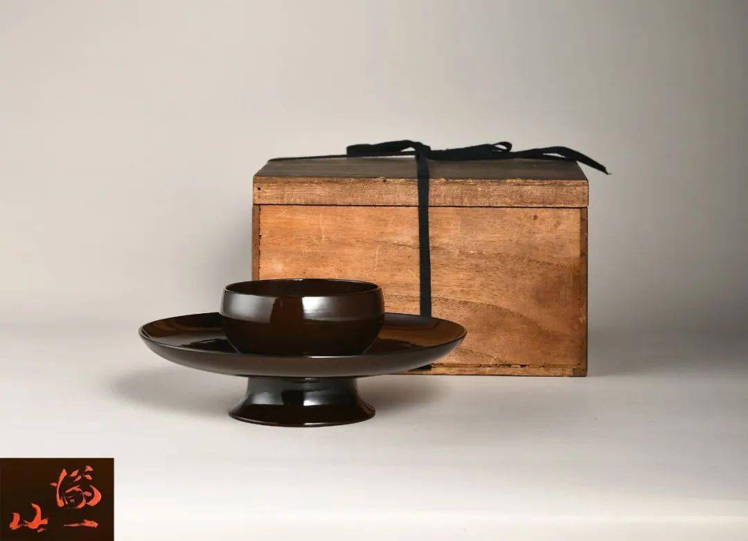 本器素身,表面髹褐色漆,内里髹朱漆,漆色匀整光润,朱红于器内莹亮,外壁褐漆包裹,精光内敛,灵韵而不失端庄。器体轻薄均整,上部呈圆口内敛,圆腹,腹较深,形致如杯。下部托呈现圆盘状,微向上展开。底部空心,圈足外撇。本品造型简约大方,两种漆色交相辉映,颇具雅意,置于案上品鉴玩赏,趣味无穷。存旧配日本木盒。