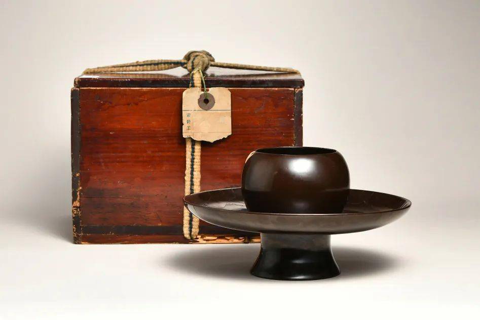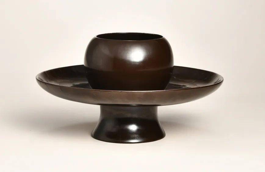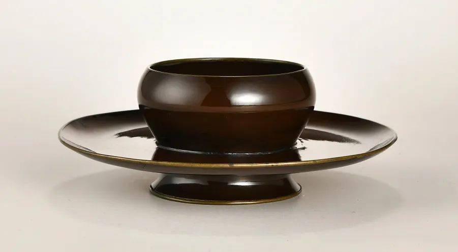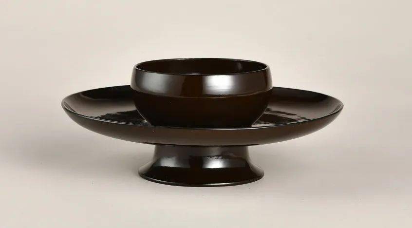 本品通体素身,髹以黑褐色大漆,器体轻薄规整,制作难度较大。上部顶圆口微敛,弧腹下收,形致如同杯子。下部托呈现浅盘状。底部空心,矮圈足外撇,足内断纹明显。顶圈、托盘口沿均包铜扣,美观耐用。通体髹漆坚实致密,精光内涵,高雅古朴,造型浑厚大气,端庄之中透露出秀美之态,为收藏之佳品。存旧配日本木盒。