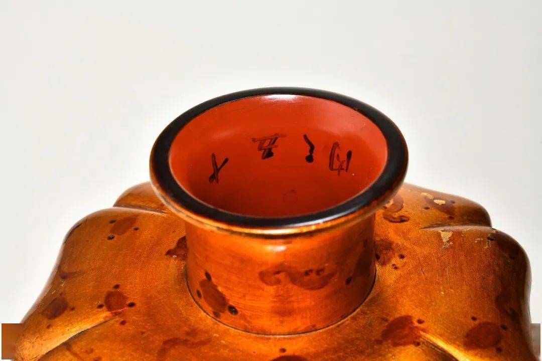 此件盏托承托处敞口微敛,气韵内涵,托盘作六瓣花口形,边缘过渡流转自然,俯而观之,宛如一朵盛开的朵花,美不胜收。下承外撇高圈足,圈足内以黑漆楷书“内之五十”款。盏圈及盘内髹朱漆余部髹金漆,玳瑁斑纹三两成组,变化繁多,错落有致,髹漆技巧精湛考究,传世髹玳瑁漆器物稀少,极为难得。整器既融入禅宗与士人意趣,又兼及世俗审美,于案赏鉴,自可品得茶艺之质,与古人同感禅、理文化之意境。本品极具视觉张力,予人耳目一新之感。 |