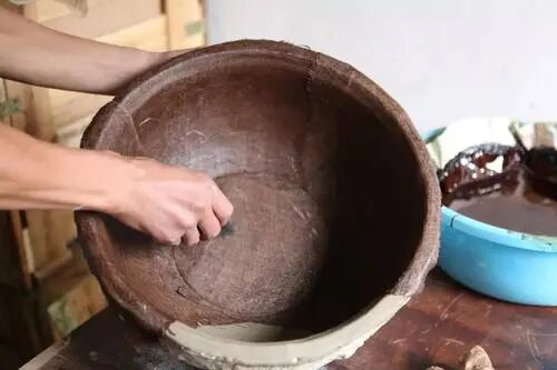 胎体制作完成后就要开始上漆,先在胎体上刮生漆,随后贴上麻布压实,再刷漆,做防水层。防水层做好后,用生漆和瓦灰调和,制成腻子,涂抹在胎体上,修补那些坑洼之处,让表面光滑平整。