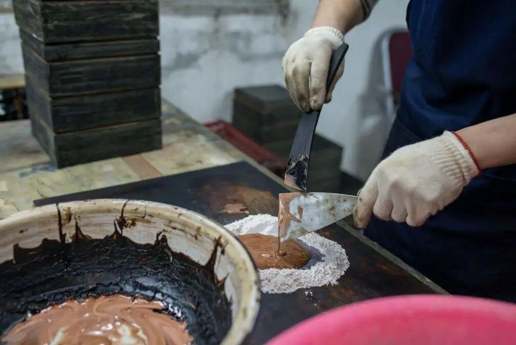 ▲天然漆在挥发水分的过程中呈现多种颜色