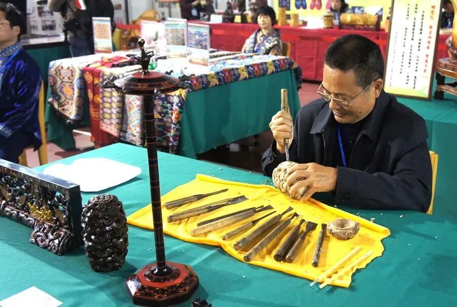 ▲漆器匠人正在对胎骨进行雕刻