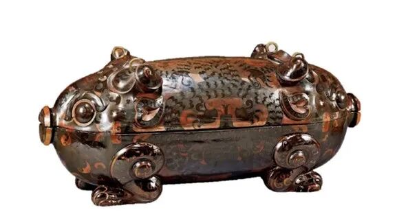 第三种是盒子,在天星观2号楚墓出土了 “猪形酒具盒”,外形是一个双头猪,这是山海经中的一种神兽,叫做并封。盒子里面可以收纳耳杯,还可以放酒壶和搁耳杯用的托盘,文人士大夫们就是用这种盒子,带着耳杯出去春游,曲水流觞,特别方便。