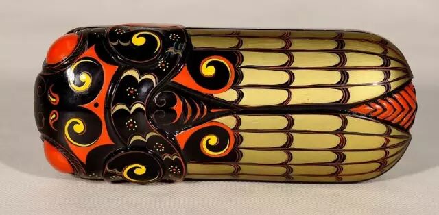 此款楚式漆器以蝉型做文房砚台,外形上类似蝉的形态。原材料使用的是精加工而成的生漆,颜料选用天然矿物色素。彩色漆料必须经过色料研磨,日晒脱水,密封存放,还需选料,雕刻,上漆、绘画、磨光等20多道工序。制作人周传志,传统工艺功底扎实又锐意创新,设计开发出“鸳鸯墨盒”等漆器,受到了社会名流的赞赏和珍藏,其父邹德香在荆州博物馆几十年,熟练掌握楚式漆器髹饰技艺精髓,复制出“蛇鸟座屏”等一大批楚式漆木器,其弟邹传军,受邀参与《铜雀台》、《楚汉传奇》等多部影视剧道具制作。邹氏家族已将这门古老传统神秘独特的技艺,打造成代表荆楚文化艺术的符号。