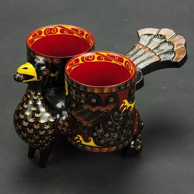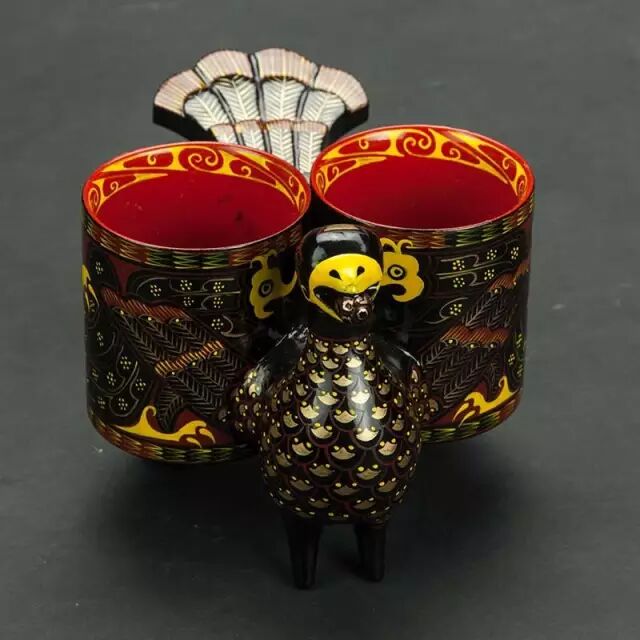 凤凰双连杯极为精美,造型是一只展翅欲翔的凤鸟,凤作昂首立状,嘴衔一小圆珠,凤腹是二杯,凤凰尾翼伸展为柄,杯下二足亦作小鸟雀展翅支撑状。