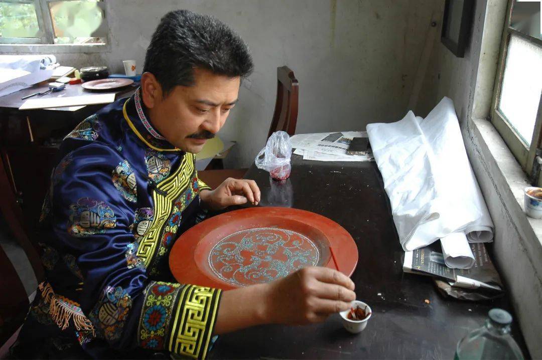 而众多工序中,羌族水磨漆艺的“盖面漆画”被称为漆艺一绝,趁漆未干时便在漆器表面作画,讲究下笔稳健、力度适中、一气呵成,并且速度一定要快,以达到“漆干画干”浑然一体的艺术效果。