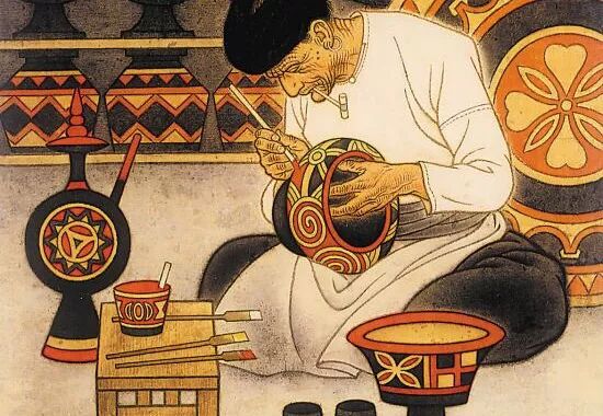 彝族所有漆器都以黑色打底,底色要上三层,每上一层都要等上一层颜色彻底风干。原色的漆调入黄色、红色矿石颜料后用于绘图。