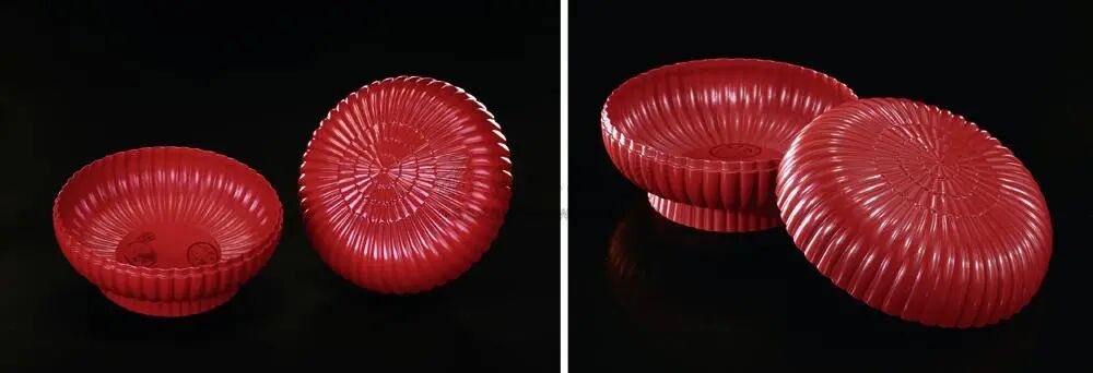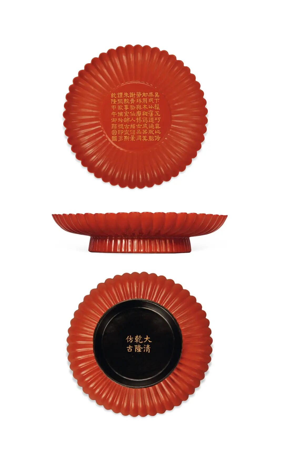 此次嘉德艺术中心漆器展中亦有一件仿漆菊瓣盘。北京翰海这件收录于《乾隆御制诗文集》,脱胎于乾隆收藏的“明永乐朱漆菊瓣盘”。仿漆瓷器由唐英创烧成功,摹仿之肖,无论造型、颜色或质感,均极近漆器。乾隆皇帝非常钟爱仿漆菊瓣形瓷器,造型有盘、盖碗等。