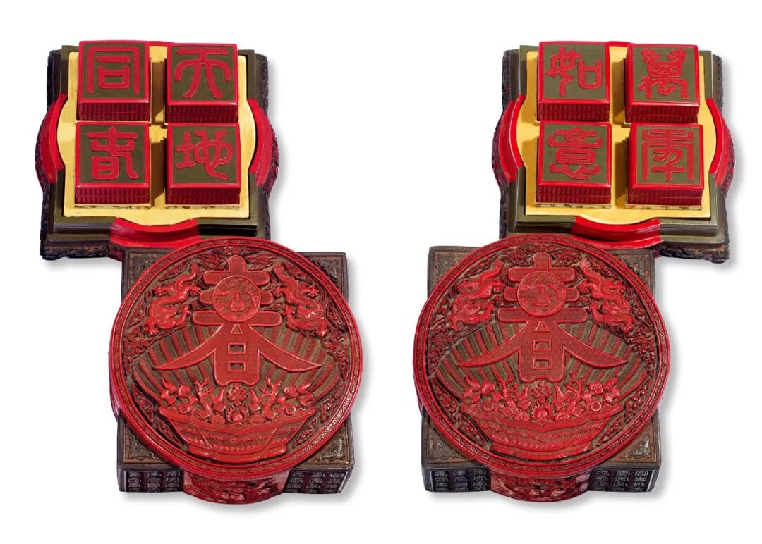 清乾隆 御制剔彩春寿琮式套盒 (一对)