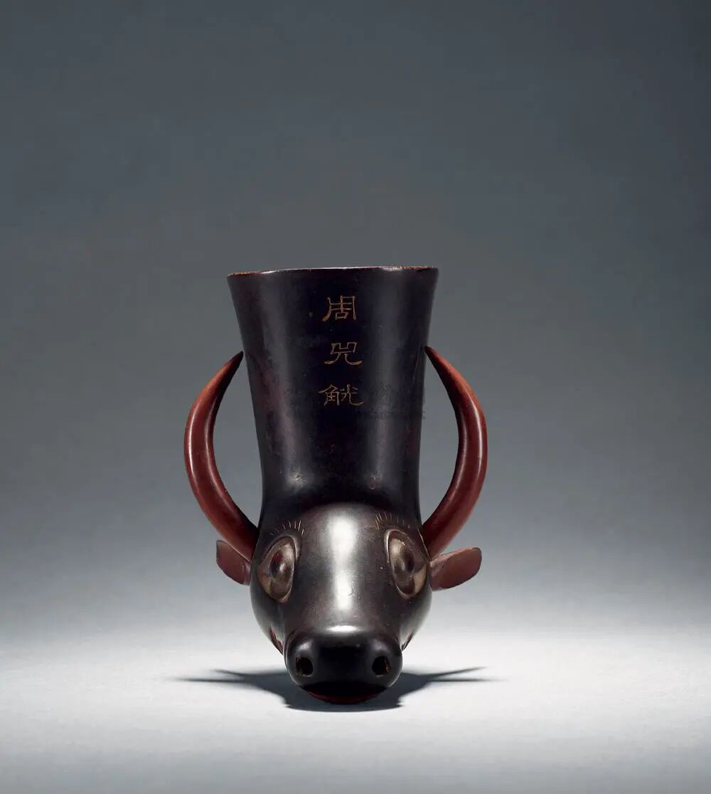 这是一件造型别出心裁,独具一格的器物。漆质,器呈牛角状,保存完整。整体素面,器身刻乾隆御制诗文。眼瞪大如铃,牛角竖立,双耳外张,虎虎生威,颇具帝王之势。器身散发缎子般的光芒,精美至极,让人爱不释手。兕觥,古代盛酒或饮酒器,或两军盟誓及国礼大典时用之礼器。端庄大气,却又精工细作,构思巧妙,工艺精湛,无论器形抑或技艺均追求极致。