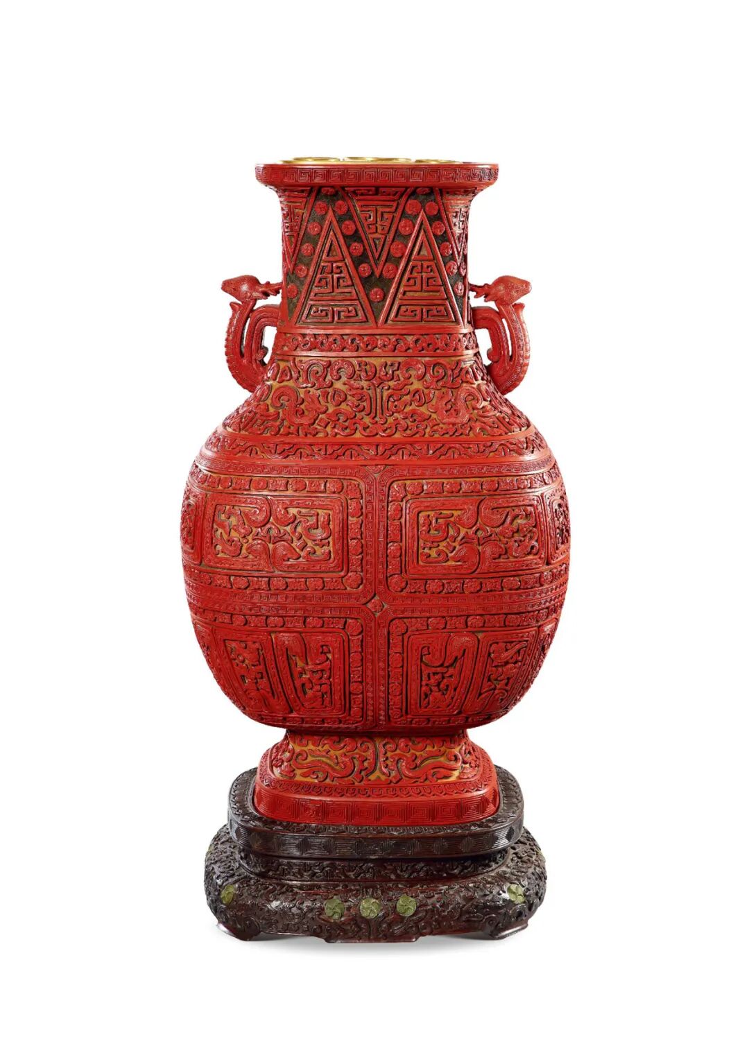 经历清初短暂的混沌后,剔红雕漆一工艺在继承元明期间多元的发展在乾隆间再度兴盛。业以成熟的多样技法与新时代风格巧妙融合,加以乾隆厚爱垂菁的推动下,创出超越前期的空前盛况。