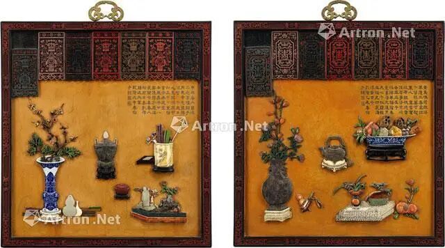 清乾隆 漆地剔彩嵌宝岁朝福寿图挂屏 (一对)