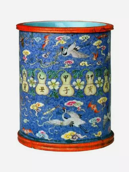 ▲清代粉彩万年甲子图笔筒
