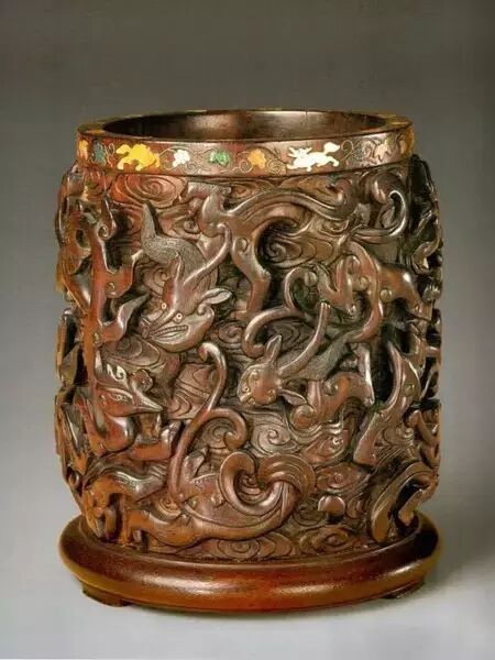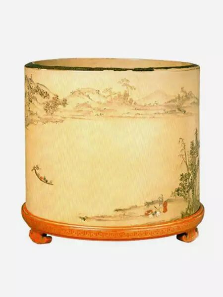 传世的笔筒也有少量象牙和玉制的,其价值也很高。从风格上看,明代多以刀代笔,构图清新,画面简洁。清代则以镂雕为主,以深雕、镂空和阴刻技法琢制山水人物等纹样,人物与景色相配,纹饰精致,层次丰富,布局繁密,立体感强。此外还有雕漆、紫砂等,各种传统的手工艺,都在笔筒上发挥得淋漓尽致。