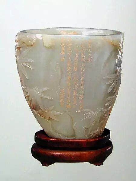 ▲清代青玉御制三友图笔筒