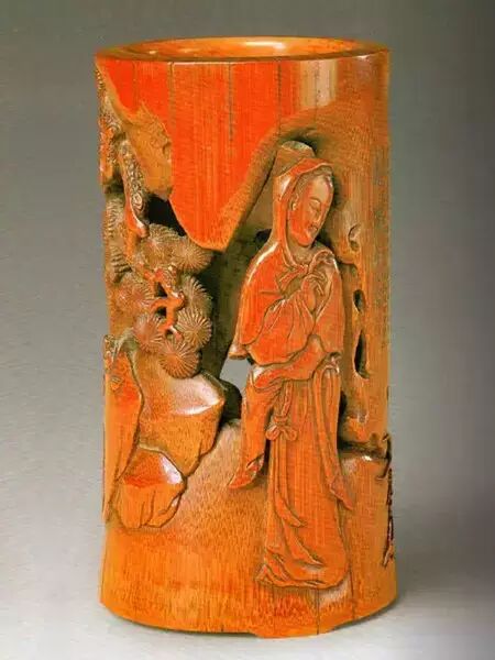 ▲明代竹雕侍女图笔筒